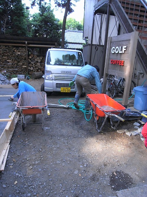 今回は場所の関係上、生コン打設がネコ打ちだったので、本社の営業マン、南波氏が手伝いに来てくれました。